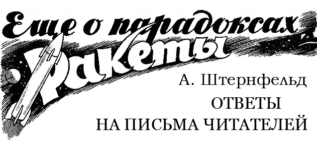 В № 1 нашего журнала за 1940 г. была помещена статья лауреата международной поощрительной премии по астронавтике А. Штернфельда «Парадоксы ракеты». Автор указывал на некоторые особенности ракетного двигателя и на те ошибки, которые делают исследователи, подходящие к ракетоплаванию без учета специфики этого дела. Положения и идеи, высказанные в этой статье, показались многим читателям настолько противоречащими здравому смыслу, что вызвали многочисленные письма и запросы в редакцию. Редакция печатает ниже дополнительные разъяснения А. Штернфельда, которые и являются ответом всем товарищам, приславшим свои вопросы.