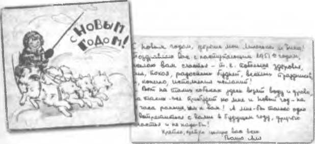 Поздравляю вас с наступающим 1951-м годом желаю вам счастья – т. е. побольше здоровья, сил, покоя, радостных будней, веселых праздников и конечно исполнения желаний!