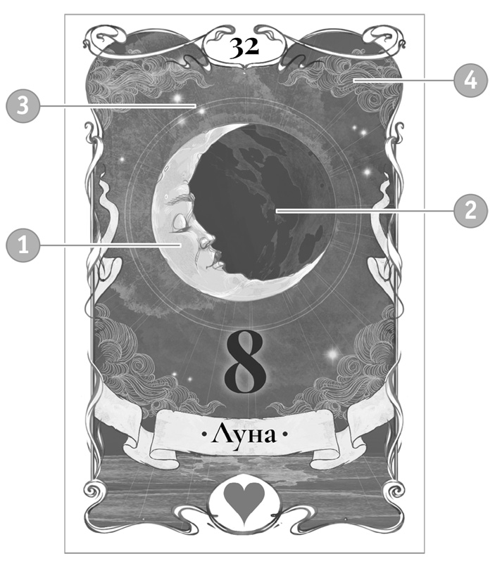 Карта Луна описывает мечтательного человека. Он загадочен и привлекателен для противоположного пола. Такой человек имеет богатое воображение, увлекается искусством или обладает рядом талантов.
