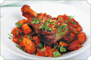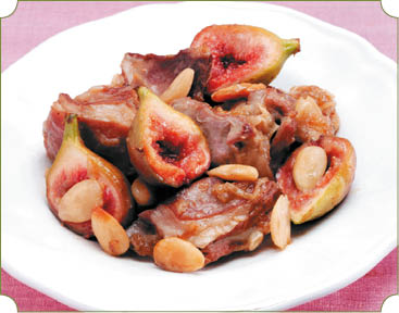 Мякоть баранины нарезать небольшими кусочками, посолить и обжарить в сковороде на жире. Выложить мясо в порционные глиняные горшочки, сверху – мелко нарезанный лук и томатную пасту. Залить небольшим количеством бульона, поставить в духовку и тушить 30 мин. Затем добавить нарезанный инжир, чернослив, пассерованную муку и запекать до готовности. В конце приготовления добавить уксус, посыпать сахаром, корицей и гвоздикой.
