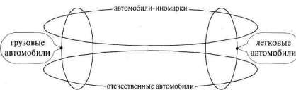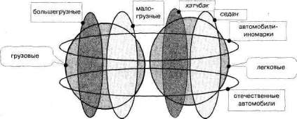 Но и это еще не все. Ведь мы не вписали сюда конкретные марки автомашин. Ну ладно, не будем вписывать все известные марки. Только для примера, по одному… Ну, давайте впишем «четверку», «шестерку», «Рено–19», «Пежо–106», «Газель», «КамАЗ», «студебекер» и какую–нибудь малогрузную грузовую иномарку, например «ситроен–берлинго». Поскольку это все отдельные понятия, то каждое из них должно быть вписано в свою отдельную фигуру (см. рис. 50).