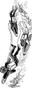 Валерий с нетерпением ожидал начала операции по прочесыванию бухты. Даже в самом худшем случае, если не будут обнаружены таинственные враги, все-таки что-то прояснится. Он с восхищением следил за водолазами, оседлавшими небольшие снаряды, в которых размещались мощные водометные двигатели. На таком снаряде водолаз мог под водой развивать скорость до тридцати узлов. Двигатель давал энергию и для прожектора, расположенного на шлеме.