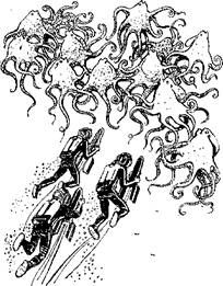 Он оказался в большой пещере. Черная тень понеслась на него откуда-то сверху, он едва успел увернуться. Палец сам собой нажал на кнопку лазера, и тонкий, как игла, луч перечеркнул атаковавшего осьминога, разрезав его на две обугленные части.