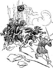 Они оставили нас в покое, но выслали вперед гонцов с известием о событиях. Когда мы достигли Никума, Искилип бросил против нас все свои силы. Одни отряды штурмовали «Золотого скакуна», другие поджидали нас в засаде, чтобы не допустить к кораблю. Мы снова построились в каре. Так что сколько бы их там ни было, биться с нами одновременно могли человек двадцать, не больше. Все же мы оставили шесть хороших парней на залитых кровью грязных улицах. Когда команда, ждавшая нас на каравелле, увидела, что Ровик возвращается, она принялась обстреливать город из пушек. Тростниковые крыши легко загорались, и это внесло такое смятение в ряды противника, что отряд, совершивший вылазку с корабля, смог соединиться с нами. Общими силами мы прорвались к причалу, взошли на борт и выбрали якорь.