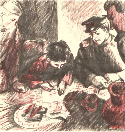 Обрадованный тем, что всё кончилось благополучно, Ион приложил руку к пилотке, повернулся и, чеканя шаг, вышел из комнаты.