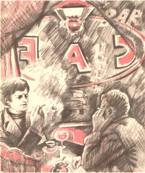 Небольшое помещение освещали подвешенные к потолку лампы, напоминающие старинные керосиновые. У стен с деревянными панелями теснилось несколько столиков. Напротив высилась стойка, сплошь облепленная листками реклам. За ней, перед полками, уставленными бутылками, как книгами, перетирал стаканы тучный усач без пиджака, в красных подтяжках.