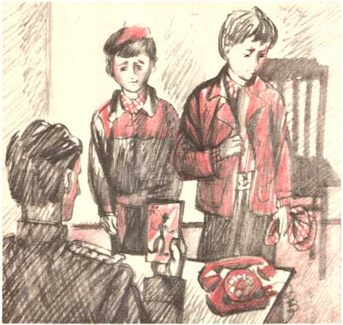 Они вошли в совсем небольшую комнату. За столом сидел милиционер с погонами капитана и говорил по телефону. Он поднял взгляд на вошедших, но ничего не сказал, а продолжал слушать кого-то в трубке. Мальчики ждали. Наконец капитан сказал в телефон: «Есть! Так и сделаем... Всего» – и положил трубку. Он выпрямился и, оглядев вошедших, спросил: