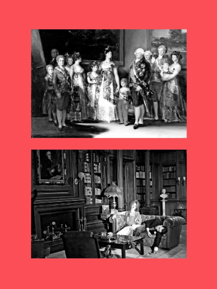 Еще одна барочная королевская семья, знаменитейшая. Полная антитеза Гойе, так как именно Веласкес первым растворяет барочную иерархию божественной вертикали, связывающей земную горизонталь с небом, в космосе пространства. В бесконечности многообразных отражений королевская чета, чье назначенье и чья прямая обязанность – над всем возвышаться, оказалась гораздо ниже не только художника, но даже и фрейлин. Причуды пространственных метаморфоз: помазанники Божии, они же родители, присутствуют, но их и нет. Они отражение.
