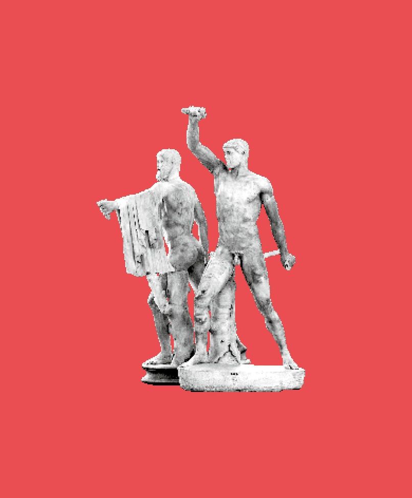 Ну, и last but not least, семья, оплодотворенная идеей. Гармодию и Аристогитону поставили памятник, так как они тирана убили. Они любили друг друга и жили вместе, так что памятник заодно и их любви. Также это первый известный мне портрет двух людей, живущих в признанном общественностью однополом браке. Благовещением – мы уже уяснили благодаря Пазолини, что без Благой Вести и Зачатия, за ним следующего, семья все же не совсем семья, – для Гармодия и Аристогитона стал гражданский призыв. Они родили месть, убийство и свободу. Больше они ничего родить не смогли: что там через анальное отверстие еще вылезти, кроме равенства, братства и свободы, может. Убийство, да разве что еще творчество, мертвенные вещи. Как сказал Модильяни, если верить Ахматовой, в общем-то, склонной приврать, «смешно быть сыном Микеланджело». И правда – обхохочешься.