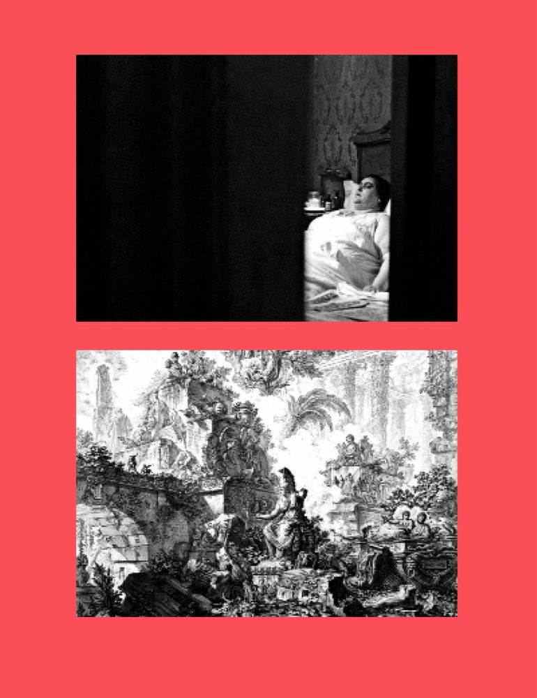 Пиранези в качестве титульного листа своей серии использовал величественное каприччо из римских руин, как реальных, так и вымышленных, громоздящихся вокруг гигантской фигуры в центре, воспроизводящей статую Минервы с фонтана на Капитолии, считавшуюся со времен Ренессанса олицетворением Dea Roma. Агрессивная и беззащитная, она двойник феллиниевской героини. Лишенная на гравюре левой руки, хотя еще в XVI веке скульптуру отреставрировали и добавили недостающую руку со вложенным в нее копьем, Богиня Рима похожа на инвалида войны, протягивающего оставшуюся правую руку за подаянием, подобно слепому Велизарию, некогда великому, а теперь вынужденному побираться. Прославляя величие Рима, она воплощает также и vanitas (тщету всего земного). Надпись на нижнем блоке над головой Минервы гласит: «Гн[ей] Помпеус с[ын] Помпея Вел[икий] / Гл[авнокомандующий] / закончив тридцать лет войны / разбил рассеял погубил захватил / в плен 12 183 000 человек / потопил или захватил 846 кораблей / занял 1538 укрепленных городов / подчинил / земли от Меотии до Красного / моря нижайше / посвящает обеты Минерве». Помпей плохо кончил: он воевал против Цезаря и после поражения при Фарсале бежал в Египет, где был убит собственным центурионом. Обломки обличают тщету словесной гордыни: памятники, воздвигнутые во имя власти, впечатляют даже после ее крушения, а слова восхваления становятся издевательским анекдотом.