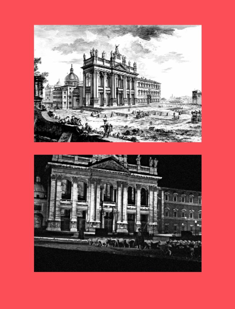 В довоенные 1930-е годы квартал Сан-Джованни-ин-Латерано, так же как и в XVIII веке, был окраиной Рима. У Пиранези, как и у Феллини, на площади царит пустота. Церковных процессий не видно, около Скала Санта, здания, хранящего Святую Лестницу и мраморные ступени из дома Понтия Пилата, освященные стопами Иисуса Христа, нет ни одного человека, а публика, движущаяся к церковным ступеням, больше похожа на фланеров, чем на богомольцев. На площади всего две кареты, одна из которых катит куда-то мимо. Однако именно находившаяся на окраине церковь Сан-Джованни-ин-Латерано возглавила список главных семи церквей города Рима. Это древнейшее из до сих пор функционирующих церковных зданий христианского Запада и центр всего западного христианского мира. Базилика была основана в 313 году императором Константином Великим после того, как в битве у Понте Мильвио он победил язычника Максенция, узурпировавшего власть в западной части Римской империи. Накануне битвы Константину было видение: он узрел в небе слова In hoc signo vinces («Сим победиши!») и ангелов, несущих крест. Константин, еще будучи язычником, в знак поверил и велел воинам отметить свои щиты знаком креста. Выигранная при Понте Мульвио битва убедила его в силе нового бога, Иисуса Христа. Сам он крестился только перед смертью, но в благодарность могущественному богу христиан издал в 313 году указ, названный Миланским эдиктом, официально уравнивавший христианство в правах с другими религиями и разрешавший строительство церквей. До этого христианские церкви ютились в подземельях-катакомбах и домах верующих. Базилика в Латерано стала первой общественной церковью, поэтому именно она, стоящая на окраине, была провозглашена еще при Константине местопребыванием главы римской общины, называемого по-гречески πάππας, что значит «отец», и носившего титул епископа города Рима. В дальнейшем именно Сан-Джованни-ин-Латерано, а не Сан-Пьетро, стал кафедральным собором Рима. Полный титул этой церкви звучит как Arcibasilica Papale Romana Maggiore del Santissimo Salvatore e dei Santi Giovanni Battista ed Evangelista al Laterano Madre e Capo di tutte le Chiese di Roma e del Mondo (Римская Папская Великая Архибазилика Святейшего Спасителя и Святых Иоаннов Крестителя и Евангелиста в Латерано Мать и Глава всех Церквей Рима и Мира). Самый старый и почетный титул папы – Episcopus Romanus (Епископ Римский). В Сан-Джованни-ин-Латерано папа возглавляет богослужение как архиерей, то есть как глава и старший наставник римской общины, ее пастырь. Об этом и свидетельствует ведомое пастухом стадо овец у Феллини. Кстати, благодаря Феллини на овцах спятил Питер Гринуэй, запихивавший их куда ни попадя.