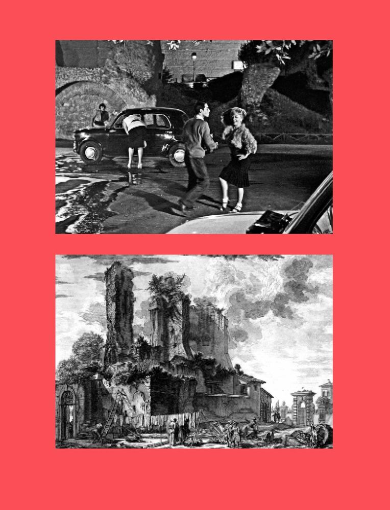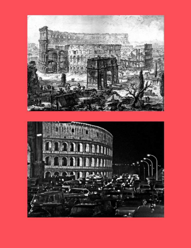 На гравюре Пиранези Колизей изображен практически с той же точки, с какой он снят у Феллини: со стороны, показывающей арку Константина на фоне амфитеатра. В XVIII веке Колизей находился на самой окраине. О развалинах ходило множество темных легенд: там гнездились разбойники, промышляли проститутки и в изобилии водилась нечистая сила. Ко времени Пиранези были сделаны только первые попытки привести Колизей в порядок и включить его в структуру города, но вплоть до середины прошлого столетия он будет оставаться приютом отверженных: после войны в нем жили бездомные. Колизей Феллини уже вычищен и превращен в музей, о чем свидетельствуют всполохи электрического света, освещающие его окна. В то же время нервно вспыхивающий красный цвет напоминает о его грозной славе, обагренной кровью гладиаторов и христиан, согласно преданию, пожираемых на его арене дикими зверями. Теперь считается, что про зверей и христиан нафантазировали историки церкви.