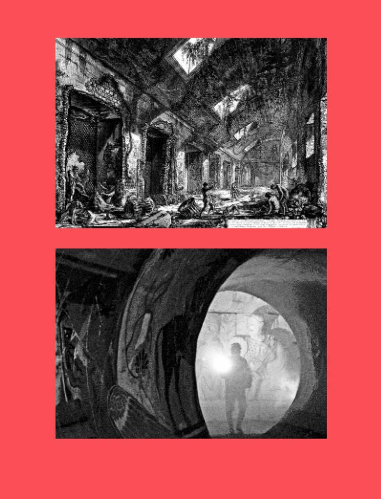 Цирк, то есть театральное представление, важен для римской жизни не менее, чем лупанарий и сенат. Неслучайно в фильме «Рим» сразу после сцены в римском варьете во время войны следует встреча с Древним Римом: эпизод с обнаруженными во время прокладки римского метро древними фресками. Наткнувшись под землей на древние пустоты, метростроители вызывают специалистов, которые находят там великолепные росписи. Но под воздействием воздуха фрески на глазах оползают и безвозвратно гибнут. Это опять же возвращает к рассуждению о соотношении времени и вечности. Сумрачные помещения, найденные под землей, напоминают виды виллы Адриана, созданные Пиранези в конце жизни и включенные в серию Vedute di Roma. Особенно – гравюру Veduta di un Eliocamino («Вид Гелиокамина»). Гелиокаминами назывались специально обустроенные комнаты для зимнего проживания с окнами под потолком, расположенные так, чтобы забирать как можно больше солнечного света и не пропускать ветер. На вилле Адриана гелиокамины, своего рода предтечи современных солнечных батарей, располагались вблизи терм. Пиранези всегда интересовали технологические изобретения древних римлян. В тексте он объясняет предназначение гелиокаминов, обозначая окна, через которые проникал свет, в примечании A. Пиранези также отмечает, что статуи, когда-то здесь располагавшиеся, были освещены особо, свет подчеркивал их красоту и ценность. Догадка о статуях – измышление Пиранези. Обломки колонн на полу также добавлены произвольно, потому что никаких колонн в гелиокаминах Адриана не было. На стене помещения и на сводах видны остатки фресок, но Пиранези никак их не комментирует, и неизвестно, являются ли они, как и обломки колонн, продуктом его творческой фантазии, или в его время фрески были еще различимы. Феллини так же в сцене в метро помещает на стены живопись, выполненную современным художником из его группы по мотивам античных росписей. Сейчас в помещениях гелиокаминов на вилле Адриана от фресок не осталось и следа. Стаффаж на гравюре гораздо крупнее, чем на других гравюрах с изображением виллы Адриана, и оживленная жестикуляция изображенных фигур намекает на некие эмоции, их переполняющие. Вид у них прямо-таки как у пришедших в ужас от потери шедевров феллиниевских археологов. Ключ к пониманию смысла происходящего у Пиранези дает фигура в центре с примитивным металлоискателем в руках: это изображение кладоискателей, которые начиная с XV века стаями слетались на виллу Адриана. Впрочем, их также можно назвать первыми археологами. Необычное присутствие трех собак в этой сцене тоже объясняется тем, что их использовали для поиска кладов.