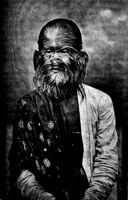 Мы были много наслышаны об особе, будто бы покрытой волосами, которая, как утверждали, больше походила на обезьяну, чем на человеческое существо; это описание, однако, как я рад сообщить, совершенно не соответствовало его внешности... Весь лоб, щеки, веки, нос, в том числе и внутренняя его часть, подбородок – короче, все лицо за исключением красноватой части губ, было покрыто у этого человека мягкими волосами. На лбу и щеках они были длиной до восьми дюймов, а на носу и подбородке – до четырех дюймов. По цвету они были серебристо-серыми, а по фактуре – шелковистыми, тонкими и прямыми. Задняя и внутренняя поверхность уха, также как и внутренность наружной ушной раковины, были полностью покрыты волосами, точно такими же, как и на лице, около восьми дюймов длиной. Именно эта особенность главным образом способствовала тому, что на первый взгляд его внешний вид казался неестественным и почти нечеловеческим.