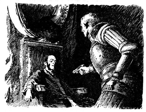 Дверь тихо скрипнула и открылась. Луч фонарика прорезал бледное сияние свечи. Показалась уродливая шарообразная фигура человека в мокрой резиновой одежде, напоминавшей скафандр. Нащупав старика, фонарик погас. Человек сделал несколько шагов и остановился.
