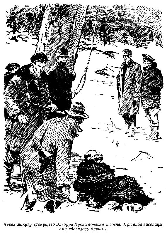 Через минуту стонущего Эльдура Кукка понесли к сосне. При виде виселицы ему сделалось дурно, от ужаса отнялся язык, онемели ноги. Когда ему на шею накинули петлю, он стал всхлипывать.