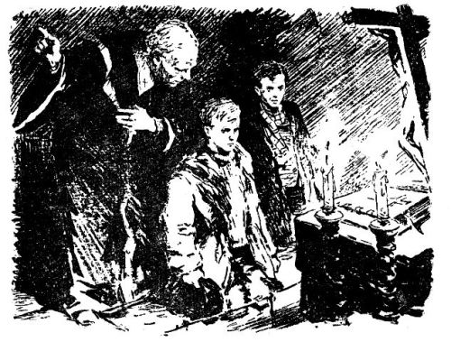 Мальчики в ужасе шарахнулись в сторону. Впереди синими серебряными узорами горит алтарь. Мимо него в черном длинном, до пят, таларе проплыл пастор. На передней скамье, уронив голову на руки, застыл в горестной позе чернобородый старик-великан в кожаной капитанской тужурке. Пастор подошел к нему и о чем-то заговорил.