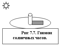Некоторые из нас забыли, что наше чувство времени первоначально было связано с пространством. Не имея электрических фонарей или наручных часов, мы замечали происходящие на Земле перемены. Мы видели когда становилось темно или светло, отмечая при этом положения солнца и звезд. То, что мы сейчас называем «временем», некогда связывалось с перемещением по земле теней деревьев, по мере того как солнце проходило свой путь по небосводу. Наш теперешний способ определения времени восходит к движению тени от центрального выступа солнечных часов, позже названого гномоном. (Рис. 7.7)