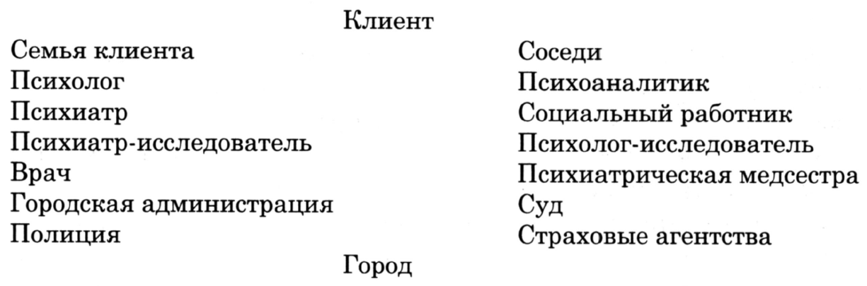 Ваша роль сопряжена со многими проблемами! Вы зачастую чувствуете себя хуже подготовленными и менее значимыми по сравнению с психологами и психиатрами, с которыми вы сотрудничаете. Вы считаете, что ваша должность недостаточно уважаема. И вы правы, но это отчасти ваша проблема. Многие из вас не хотят утруждать себя долгой и напряженной подготовкой, предлагаемой аналитикам, психиатрам и психологам. Но возможно, в этом вы правы – некоторые из видов подготовки не так полезны, как могли бы быть! Почему бы вам чётче не обрисовать проблемы своей профессии и не найти ту подготовку, которая вам нужна, подготовку, которая помогла бы заполнить пробелы между психологией индивида и городскими проблемами? Рекомендую вам заново определить свою роль. На рис. 14.2 схематически показано ваше положение относительно окружающего мира.