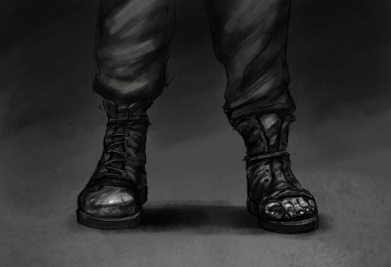 Один из шнурков развязался, а второй полностью отсутствовал. Он был похож на ребенка, впервые пытающегося одеться без мамы. Ботинки, в которые он был обут, явно прошли не один километр. Стальной носок левого ботинка был частично оголен, а другой полностью отсутствовал. Таким образом, нога оставалась открытой. Судя по всему, его отвратительной ноге не помешал бы свежий воздух, но это будет сделано за счет человечества.