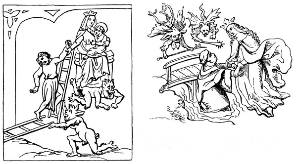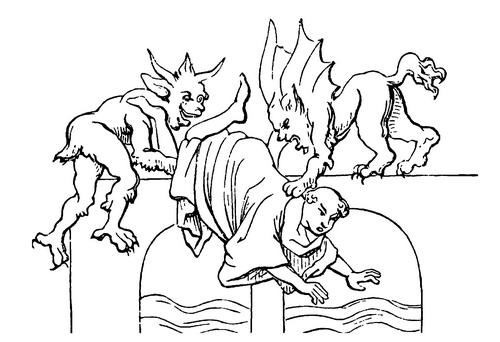 Как выясняется из показаний визионеров и возвращенцев с того света, душу, или ее оболочку, рвут щипцами, молотят молотами, бросают из огня в холод и из холода в огонь. Время от времени приходят известия о специальных муках, коим подвергаются отдельные грешники. Так случилось, например, с господином Теодорихом, богатым человеком, любителем широкой жизни и женщин. Спустя несколько дней после его кончины сторож церкви, покровителем которой был покойный, увидел во сне огромную колонну, высившуюся во дворе Теодориха. Она была утыкана острейшими лезвиями и достигала небес. Демоны таскали его душу вверх и вниз вдоль всей этой колонны, распевая песенку об оставленном богом и проклятом грешнике. Жуткое впечатление, какое должен был произвести этот рассказ на читателей и слушателей, вероятно, еще усугублялось тем, что автор прилагает к нему и ноты бесовской кантилены (НМ, 21).