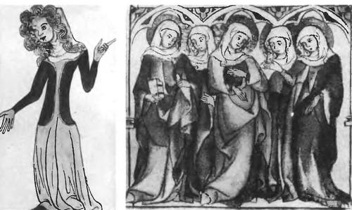 Множество «примеров» нападкам на женщин посвящает Этьен де Бурбон. Особое беспокойство внушает ему страсть женщин украшать себя. Нарядные платья, пышные прически, притирания и другие хитрости – все это плод дьявольского внушения. С помощью этих средств женщины губят сыновей Господа. К подобным ухищрениям прибегают даже старухи, так что на улице можно догнать молоденькую красавицу и, заглянув ей в лицо, увидеть старуху. Так случилось с одним парижанином, вообразившим, что он следует за юной красоткой, – каково же было его разочарование, когда он узнал свою старую жену! (ЕВ, 273). Жена раскрашивала свое лицо, несмотря на запрет мужа, и однажды он, увидев ее на каком-то празднике раскрашенной, спросил ее: «А где моя жена Понция?» «Перекреститесь, неужели я не Понция, ваша жена?» – «Ты не моя жена. Моя жена смуглая, а ты белая; та бледная, а ты – розовая». – «Богом клянусь, я жена ваша Понция». – «Если ты моя жена, я попробую, не смогу ли я обновить картину, кою вижу на твоем лице». И, схватив ее за волосы, он стал щеткой оттирать ей щеки, пока не показалась кровь (Klapper 1914, N 155).