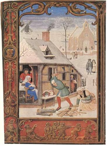 Домашняя жизнь – колка дров. Миниатюра из фламандского календаря начала 16 в.