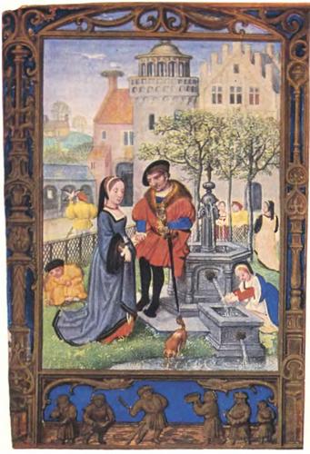 Кавалер с дамой в саду у фонтана. Миниатюра из фламандского календаря начала 16 в.