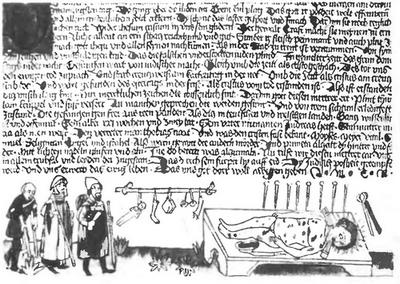 Ребенок, убитый иудеями в ритуальных целях. Миниатюра из рукописи 15 в.