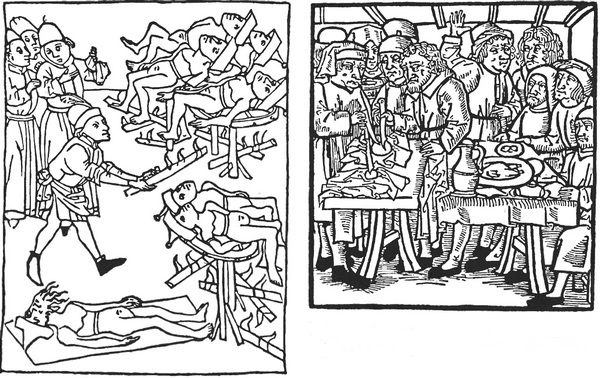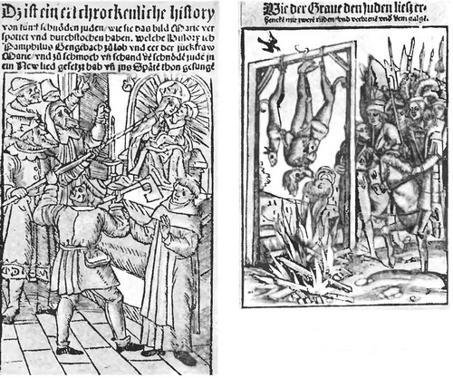 Совершенно иную картину рисуют «примеры» немецких проповедников. У них более отчетливо, чем у французов или англичан, выражен страх перед «чужими», будь то еретики или инаковерцы. Антисемитизм уже пустил на германской почве более глубокие корни и принес более ужасные плоды, нежели в соседних странах Запада. Цезарий Гейстербахский и особенно Рудольф Шлеттштадтский подробно останавливаются на сюжетах, связанных с иудеями и их злокозненностью. Свыше трети всех «примеров» в «Достопамятных историях» Рудольфа Шлеттштадтского посвящены поношению иудеев и живописанию заслуженной ими расправы. За вымышленные преступления против христиан и христианской религии на их головы обрушились страшные кары – знаменитые еврейские погромы, разразившиеся во Франконии и на Верхнем Рейне в 1298 году. Рудольф пишет вскоре после этих событий, по горячим следам. Впечатление от его повествования усиливается вследствие того эпического спокойствия, с каким явно сочувствующий погромщикам автор детально рисует преследования и массовые убийства. Он целиком и полностью принимает мотивировки антисемитских гонений, которые были тогда (и впоследствии) в ходу, хотя и не скрывает, что прямым их результатом были захват и разграбление имущества жертв.
