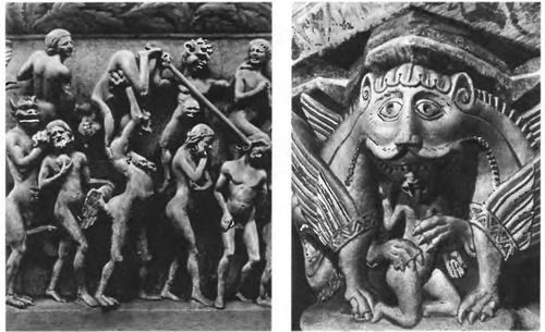 Дьявол, пожирающий душу человека. Капитель в церкви Сен Пьер де Шовиньи. 12 в.