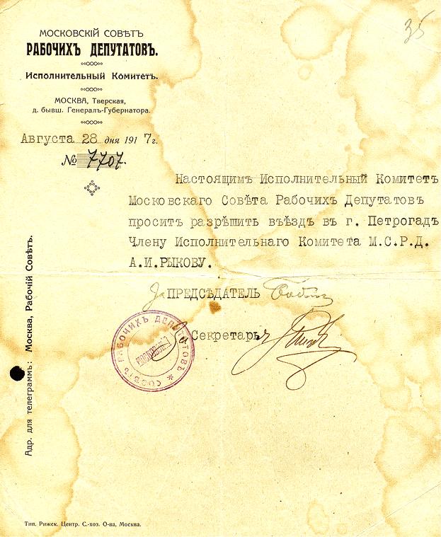 Разрешение Моссовета на въезд Рыкова в Петроград. 28 августа 1917 года [РГАСПИ. Ф. 669. Оп. 1. Д. 25. Л. 35]