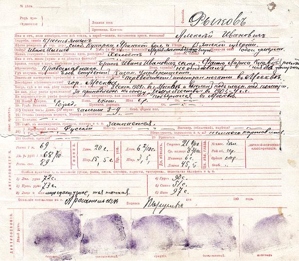 Карточка арестованного Рыкова. 1909 год. Дело было прекращено… [РГАСПИ. Ф. 669. Оп. 1. Д. 27. Л. 1–1 об]