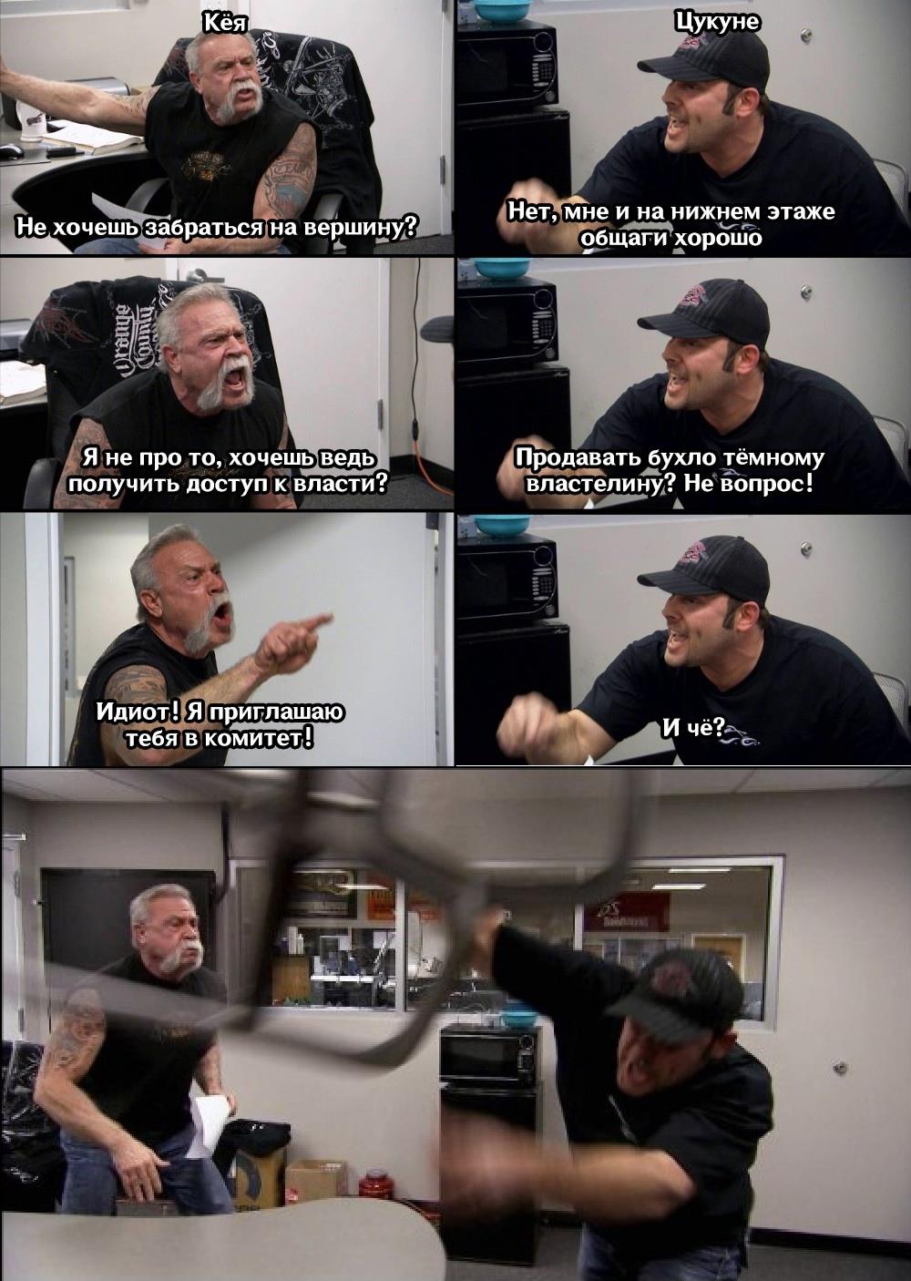 – Я себе знаю, а вы думайте, что хотите! – заявил ему под общими недоумевающим взором его свиты, не знающей, как реагировать. – Говорите, что можете как-то купить меня или чем-то надавить? Хех. Попробуйте! Мне-таки не сложно устроить себе небольшой праздник, поднять цены на товар и объявить, из-за кого мне пришлось пойти на столь тяжёлый шаг.