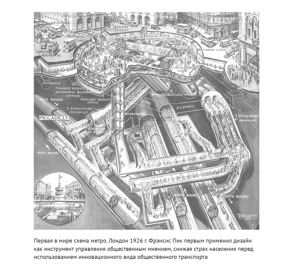 А роль «арт-директора» в таких студиях выполняют «Пинтерест», «Биханс», «Дрибббл» и прочие подобные ресурсы. Об этом рассказано во второй части книги. Одним из первых известных мне примеров блестящей работы в качестве дизайн-директора можно считать деятельность Фрэнка Пика (1878–1941) на посту исполнительного директора лондонского метрополитена в начале XX в. Благодаря дизайнерскому подходу ему удалось решить ключевую проблему – заставить людей передвигаться метрополитеном, перед которым лондонцы испытывали страх. Подробнее об этом замечательном примере можно узнать в прекрасной книге Адриана Форти «Объекты желания».