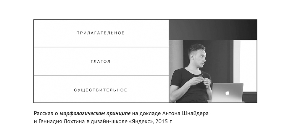 Придумав морфологический подход в дизайне, я не был уверен, что термины «существительное», «глагол», «прилагательное» и сама «морфологическая» теория воспримутся дизайн-сообществом и несколько лет использовал морфологический метод для своих внутренних задач. Но первый выход в свет данной терминологии на лекции Геннадия Лохтина и Антона Шнайдера в дизайн-школе Яндекса в 2015 г. не нашёл какого-то сопротивления или возражения. Со слов Антона, «как будто это очевидно, и так и должно быть». В том же году с Антоном Шнайдером и Андреем Зубриловым мы рассказали о «морфологии» на лекции в Суздале и не только не нашли сопротивления, а термины постепенно вошли в словарный обиход. Сейчас я периодически встречаю их в информационном поле.