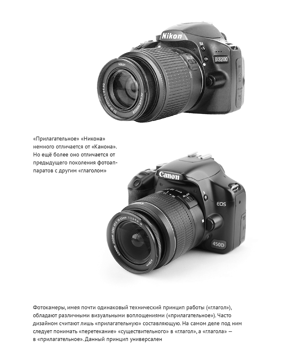 Ниже приведён конкретный пример «существительного», «глагола» и «прилагательного» на фотокамерах. «Существительный» дизайн отвечает на вопрос «кто?» и «что?», описывая предметную область дизайн-проекта, что вообще является объектом проектирования и каково его предназначение, сценарий использования, целевая аудитория и т. д. «Дизайн-глагол» – действие по превращению технического задания («существительного») в действующий образец с учётом технологических, бюджетных и прочих факторов. Процесс часто выглядит как конструкторская, инженерная работа. И «прилагательный» дизайн – наделение будущего предмета эстетическими или любыми другими признаками эмоционального окраса: «мужской», «кричащий», «нейтральный», «синий», «детский», «русский» и прочее. В случае с фотокамерами «существительным» является общественный заказ на компактные бытовые и профессиональные фотокамеры, «глаголом» – их техническое воплощение, будь то плёночный принцип или принцип создания цифрового изображения с помощью светочувствительной матрицы.