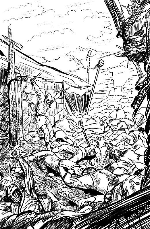 Также разведчики сообщили, что селение не рядовое, в нём имеется укреплённый воинский пост. Хотя правильнее – имелся. Невысокая башня и примыкающий к ней треугольник неровной каменной стены на поросшем травой валу. Гарнизон из почти двух десятков солдат врасплох застать не удалось, успели занять оборону. Неизвестно смогли ли они пустить кровь врагам, зато им её хорошенечко выпустили всю до капли. Причём буквально. Нескольких схваченных живыми бедолаг зверски пытали, после чего прибили к стене кольями.