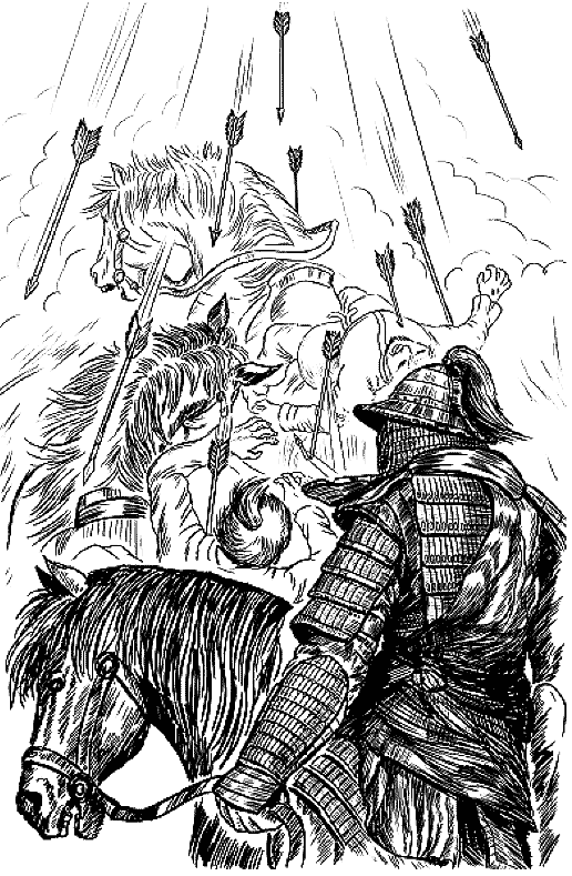 Дальнейшее и вовсе на чудо походило. Утыканные стрелами люди и кони расступились, открыв, наконец, свободный путь к нам. И командир помчался по броду всё с той же поразительной скоростью, не замедляясь. Казалось, его конь до дна копытами не достаёт, отталкивается от воды.