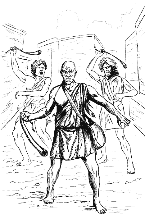 Тем временем оборванцы с пращами начали показываться на окрестных крышах, камни полетели слева и справа. И в тылу толпы просматривалось нехорошее движение, к нападавшим непрерывно стекалось подкрепление.