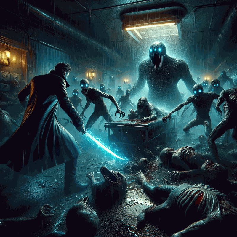 Чужестранец мысленно насчитал количество целей и бесшумно зашагал вниз. Он застал жуткую сцену трапезы. Пол лестничного пролёта был залит тёмной, вязкой жижей – смесью крови, разорванных внутренностей и той самой синеватой слизью, пульсирующей в глазницах оживших мертвецов.