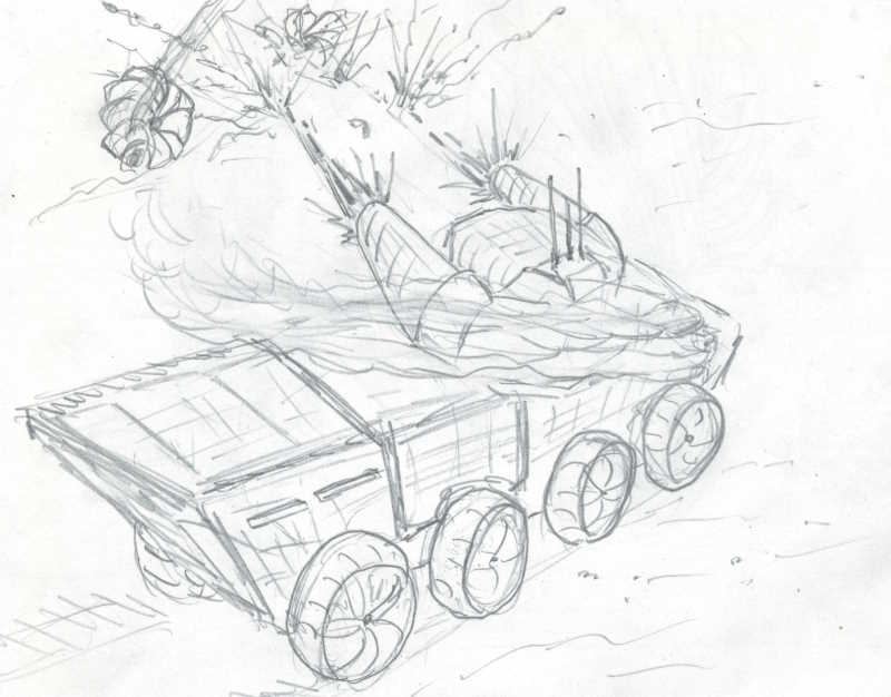 Большая 8-колесная машина, будто сорвавшийся с цепи голодный пес, выбрасывая снежные комья и грунт, рванула в сторону поля разбросанных обломков марсианского летательного аппарата. Яркие желтые мерцающие росчерки осветили сумрачное место схватки, лизнув матовое пластинчатое покрытие вращающегося подобно моно-колесу противника. Светящийся красным оплавленный след с каскадами искр ознаменовал собой удачное мимолетное попадание луча на 5-секундном излете. Большая же часть его энергии ушла в грунт, пропоров камни и растопив снег, высвободив при этом облако жаркого, но быстро застывающего белого пара. Частичного попадания оказалось недостаточно, чтоб сразить «колесо», но хватило, чтобы существенно замедлить его. Из «раны» тем временем повалил густой сизый дым. Бронетранспортёр стремительно шел на сближение, чтоб перехватить робота-разведчика с артефактом на борту. Его башня с двумя стволами по бокам пришла в движение, выцеливая приближающиеся «колеса». Те ускорились, оставив раненого «бедолагу» позади. На небольшом пригорке по пути движения они подпрыгнули и на высоте в несколько метров раскрылись, как парашюты, планируя и снижаясь. Они ловили движения разряженных воздушных масс и направляли свои тела на перехват небольшого 4-колесного робота, который пытался уйти под защиту машины побольше. Казалось, что шансов успеть у него нет, пока ярко оранжевым светом не блеснул очередной луч, который, быстро мерцая, двинулся по снежной целине, мгновенно расплавляя ее белые массы и вызывая испарения с глухим шипением. Плотная белая пелена сокрыла марсиан на какое-то мгновение, пока мороз не сделал свое дело, притянув влагу обратно к земле. Высокочастотный мерцающий луч тем временем прочертил борозду до грунта и метнулся ввысь, полоснув один из колес-парашютов. Яркий сноп искр разлетелся во все стороны, накрыв поляну горящими оплавленными микро-частицами. Парашют спикировал вниз, превращаясь в «колесо». Скорость его заметно упала. Что-то внутри него оставляло сильный дымный след, как и у его собрата, отставшего где-то позади. Остальные 3-е тут же схлопнули свои «паруса» и камнем устремились к поверхности, насколько позволяла невысокая гравитация Марса. Спустя минуту от бронетранспортера отделился еще один быстро мерцающий луч, а затем еще. Все колеса попали под удар, заметно растратив свой изначальный пыл. Их движения теперь уже были куда более предсказуемые. Но и дымы затихли совсем, а «раны» затянулись. Первые два «колеса» весьма резко развернулись в некие подобия жуков-панцирников. По бокам в виде скруток из матовой темно-серой материи возникли конечности. Спереди появились некие подобия беспалых лап с трубками на конце. Они быстро направили их на главную угрозу для себя. Похожий на гром звук с яркими вспышками ознаменовался вылетом шаровых молний прямо по мчащийся наперерез 8-колесной машине. Оба огненно-белых вибрирующих и искрящихся шара метнулись в ее сторону с упреждением. Растресканные на морозе остатки резинового покрытие выдержали удар, но весьма быстро пришли в окончательную негодность. Еще две твари так же приготовились к атаке, выбирая позиции, чтоб не попасть под перекрёстный огонь своих же.