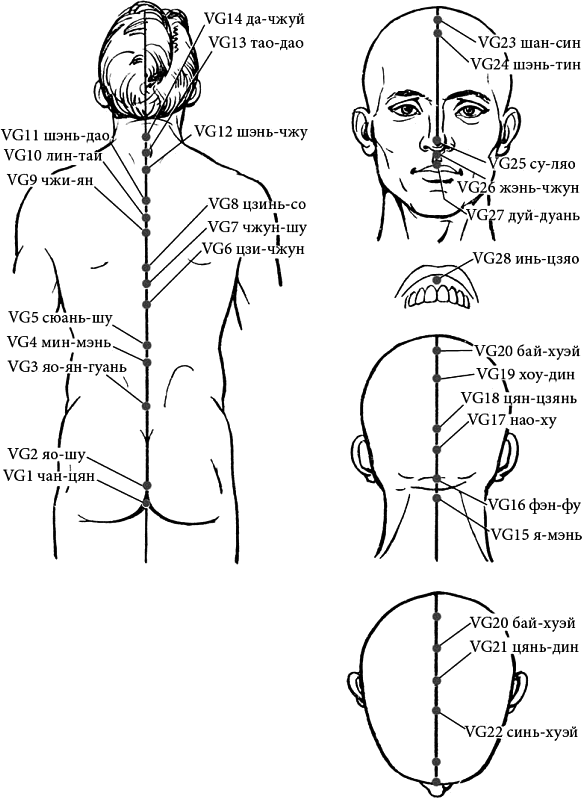 Заднесрединный меридиан (VG)Общие показания к использованию заднесрединного меридиана ду-май (VG) – нервное и психическое перенапряжение, различные невралгии, нарушения кровообращения головного мозга, головная боль различного происхождения, заболевание позвоночника с болью в спине, плечевом поясе, затылочной области с ограничением движений позвоночника, хронические воспаления в легких, горле, ушах и в носу. Задний срединный меридиан важен, так как обладает точками, которые имеют сегментарную общность с разными органами, и через эти точки возможно целенаправленное воздействие на те или иные органы. Воздействие на нижние точки меридиана оказывает более эффективное влияние на автономную нервную систему, а в области головы – на головной мозг. Особенно важная роль этим срединным линиям придается в практической акупунктуре детского возраста. Меридиан способствует гармонизации функций, оказывая влияние преимущественно на ян-меридианы, в основном на физическую силу.
