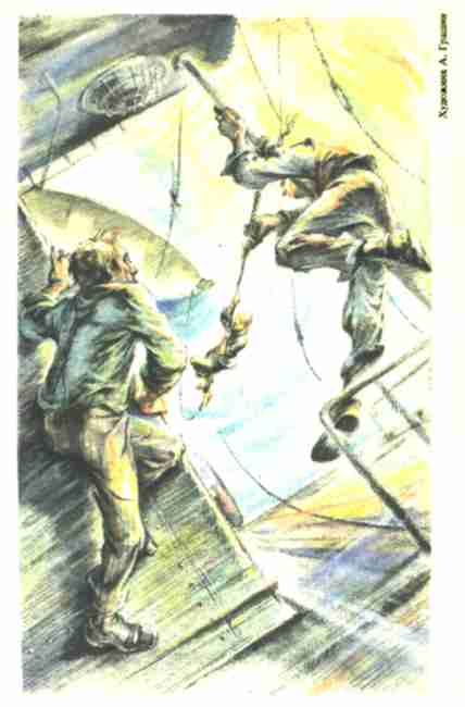 – Как нам повезло, что Сэм нашел эту лестницу, – снова воскликнул Вильям Андерсон. – Иначе как бы мы смогли добраться до иллюминаторов в кормовых каютах? А так прислонишь ее к нижней ступеньке трапа, которая, правда, стала верхней, и можно дотянуться до чего угодно в рубке.