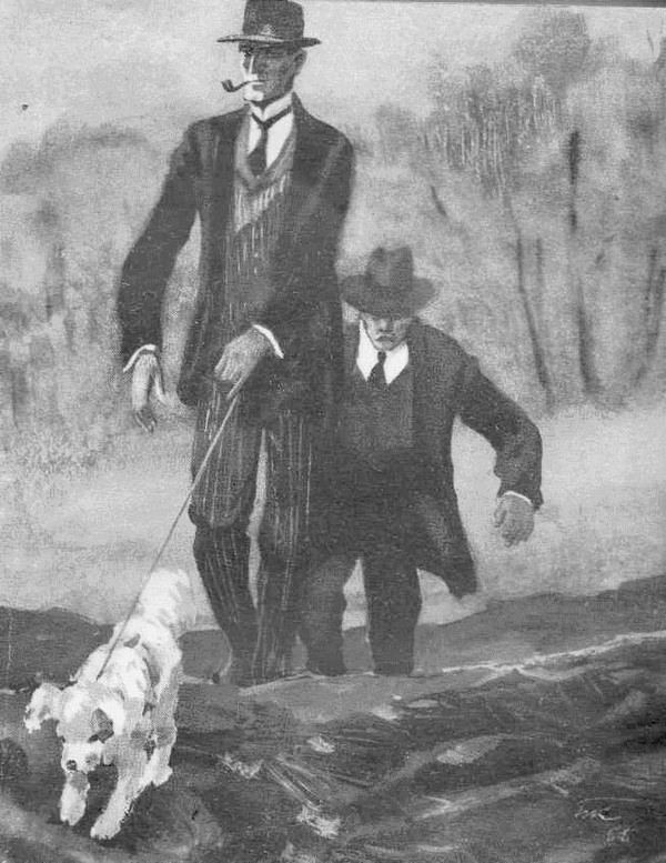 Холмс сунул собаке под нос платок, испачканный креозотом. Расставив свои лохматые ноги и смешно задрав вверх одно ухо, Тоби нюхал платок с видом дегустатора, наслаждающегося букетом старого вина. Холмс бросил платок подальше, привязал толстый шпагат к ошейнику собаки и подвел ее к бочке. Собака немедленно залилась тонким, возбужденным лаем и, уткнув нос в землю, а хвост задрав вверх, помчалась по следу с такой быстротой, что поводок натянулся, и мы бросились за ней бежать изо всех сил.