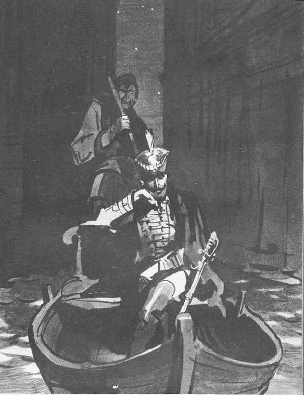 [Закрыть], а меня уже дожидается записка от Лючии и гондола. Она умоляла меня приехать не мешкая, потому что с ней случилась беда. На такую записку у французского офицера может быть только один ответ. Через секунду я был уже в гондоле, и гондольер, отталкиваясь веслом, поплыл по темной лагуне. Помню, садясь на скамейку, я еще подивился, какой это здоровенный малый. Хоть и невысок ростом, зато плечи широченные, я таких сроду не видывал. Но гондольеры в Венеции народ крепкий, и силачей среди них немало. Так вот, он занял свое место у меня за спиной и стал грести.