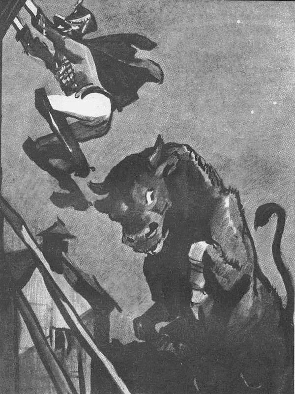 Я уже говорил, что окно спальни Мари было как раз над дверью. Занавески были задернуты, но не плотно – сквозь щели пробивался свет. Я был молодой, ловкий и поэтому знал, что смогу высоко прыгнуть, ухватиться за край подоконника и, подтянувшись, уйти от опасности. Подпрыгнул я в тот самый момент, когда чудовище настигло меня. Я и без посторонней помощи вскочил бы в окно. В великолепном прыжке я уже оторвался от земли, как бык поддал мне сзади, и я, как пушечное ядро, влетел в окно и упал на четвереньки посреди спальни.