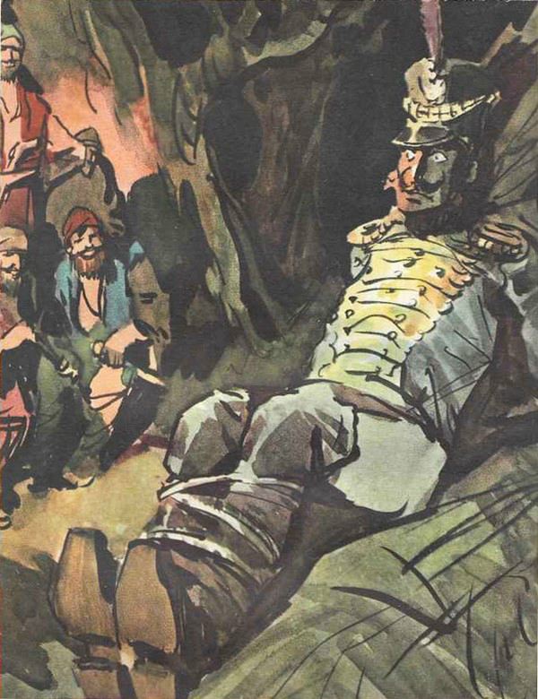 Я был так ошеломлен, что на мгновенье застыл. Затем я кинулся на сидевшего с безмятежной улыбкой главаря и перервал бы ему глотку, если бы меня не оттащили трое бандитов. Я снова и снова бросался к нему, отбрасывая от себя то одного, то другого; задыхаясь, я выкрикивал ругательства, боролся изо всех сил, но так и не смог вырваться. Наконец меня в изорванном мундире, с окровавленными запястьями оттянули назад, скрутив мне руки и ноги веревками и канатами.