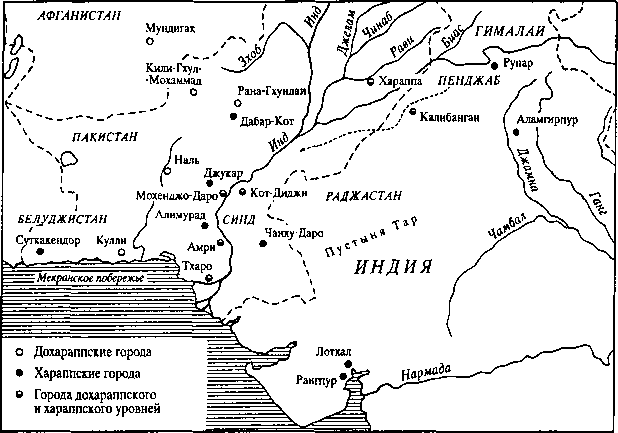 Итак, остается выяснить, в какой мере эти первые деревенские культуры смогли подготовить образование городской цивилизации. Когда в результате раскопок в 1920 г. были обнаружены Хараппа и Мохенджо-Даро, цивилизация Инда предстала как нечто появившееся ex nihilo.Недавнее открытие многочисленных дохараппских поселений, или уровней, в белуджистанском предгорье, затем на равнине в Амри, в Кот-Дижи и в Калибангане лишь слегка приблизило нас к разгадке этой тайны. Возможно, распространившись на Иранском плато, а затем в горных долинах Афганистана и Белуджистана, первые деревенские культуры столкнулись с препятствием в виде высоких гор на севере и болотистых джунглей на юге. В Синде продвижение цивилизации было остановлено морем, которое в то время заходило дальше, чем сегодня, вглубь субконтинента. В конце концов, спускаясь с гор, поселения заняли предгорья, преобладающие над равниной, затем побережье реки, и их население приспособило к новым условиям уже частично внедренные в горных долинах такие технические новшества, как террасное возделывание культур и ирригация.