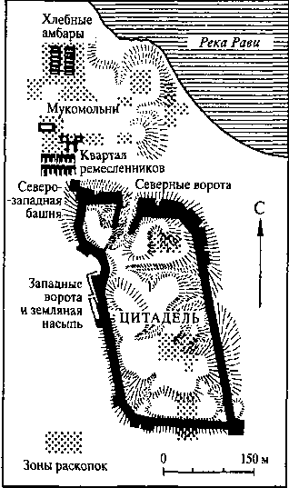 В Мохенджо-Даро был обнаружен новый слой построек. Несмотря на то что уровень почвы поднимался с каждым разливом Инда, новые сооружения воздвигались почти точно на месте предшествующих и не особенно изменялись в плане; на протяжении почти тысячелетия направления улиц оставались теми же. Письменность населения индской цивилизации не испытала никакого развития, и все указывает на то, что один и тот же тип социальной организации преобладал на протяжении всей ее истории. Главные города были построены по одному плану. В западной части каждого из них поднималась «цитадель» – искусственная земляная площадка в несколько метров высотой, обнесенная зубчатой стеной, защищающей общественные строения. Ниже располагался собственно сам город, достаточно часто окруженный крепостной стеной и занимавший многие сотни гектаров. Важные магистрали пересекались под прямым углом, деля город на четырехугольники, внутри которых улицы образовывали целую сеть без четкого плана. Ни в Хараппе, ни в Мохенджо-Даро не было найдено сооружений из камня; жилые дома и общественные постройки были сделаны из обожженного или высушенного кирпича одинакового размера. Жилища были, как правило, двухэтажными, построенными по одному плану и имели четырехугольный двор, куда выходили различные помещения. На улицу были обращены слепые фасады, сложенные из сплошного кирпича, что должно было представлять однообразное зрелище. В каждом доме имелась ванная, где жители Хараппы мылись стоя, как большинство современных индусов, выливая воду из кувшинов себе на голову. Желобки увлекали использованную воду в канализацию из обожженного кирпича, проходящую под главными улицами и достигающую места общего стока.